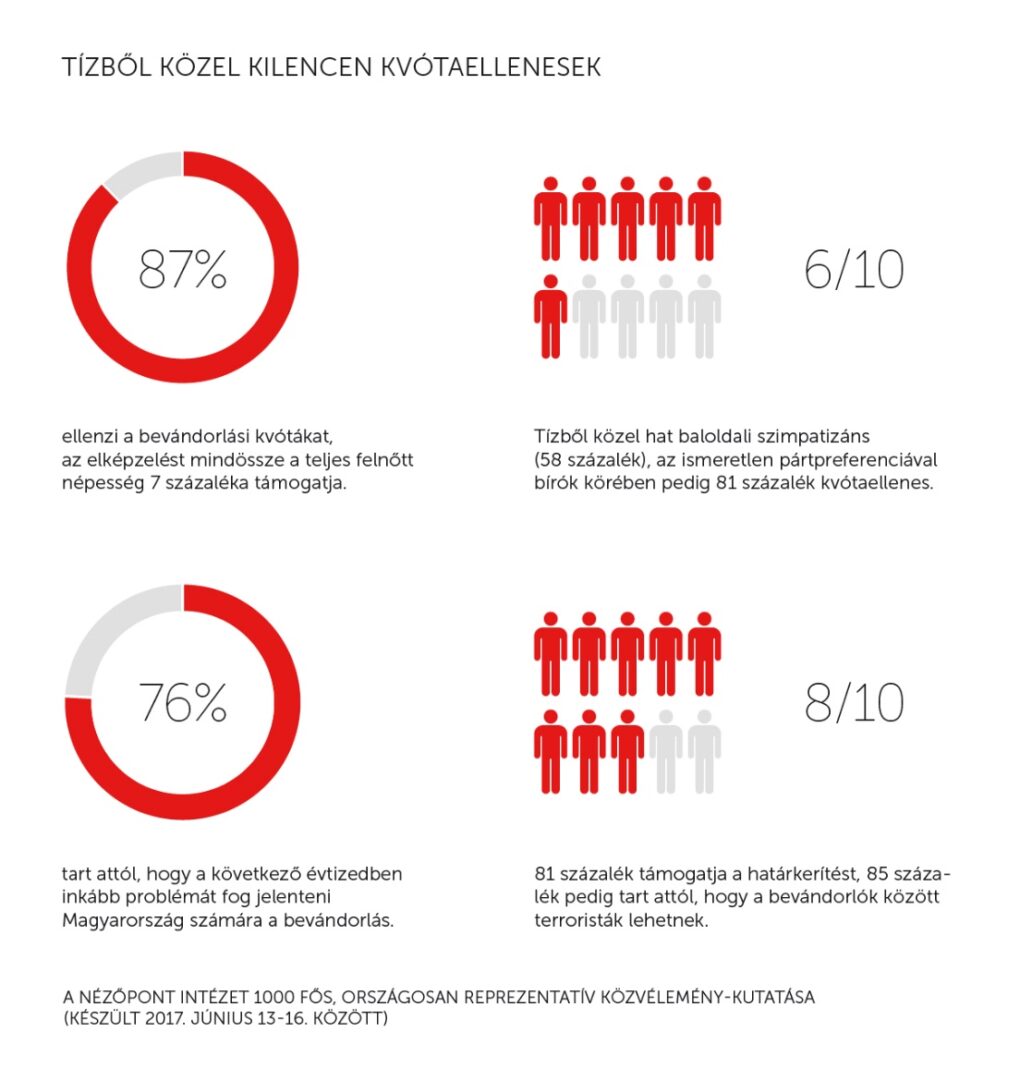 Noha az Európai Bizottság kötelezettségszegési eljárást indított hazánkkal szemben a bevándorlási kvóták elutasítása miatt, a magyarok 87 százaléka kvótaellenes. Az elképzelést mindössze a teljes felnőtt népesség 7 százaléka támogatja. A bevándorlók kvóták szerinti szétosztását tízből közel hat baloldali szimpatizáns (58 százalék), az ismeretlen pártpreferenciával bírók körében pedig 81 százalék ugyancsak ellenzi.