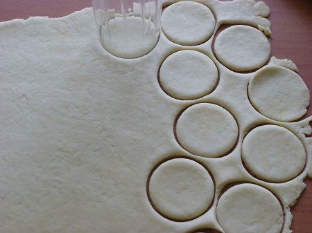 3. Lisztezett felületen nyújtsd ki a tésztát, nagyjából fél cm vastagra, majd egy pohárral szaggass belőle nagyobb köröket.