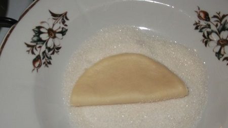 4. A cukrot öntsd egy tálba. A kiszaggatott tésztákat hajtsd kettőbe és az egyik oldalukat mártsd bele a cukorba. Újra hajtsd kettőbe a tésztát és az egyik oldalát mártsd bele a cukorba.