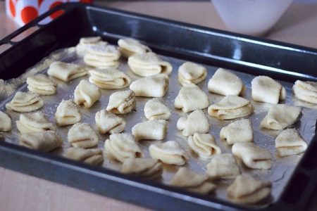 5. Egy tepsit bélelj ki sütőpapírral és a félbehajtott süteményeket tedd bele, a cukrozott felükkel felfelé. 180 fokos sütőben nagyjából 25 – 30 perc alatt süsd meg.