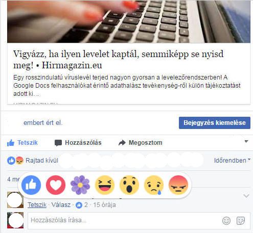 Most megint újított a Facebook, ezentúl már a kommenteknél is használhatod a korábban bevezetett emojikat. A módszer ugyanaz: vidd az egeret a “Tetszik” gomb fölé, ekkor előugranak az emojik, te pedig kiválasztod azt, ami a szívednek kedves.