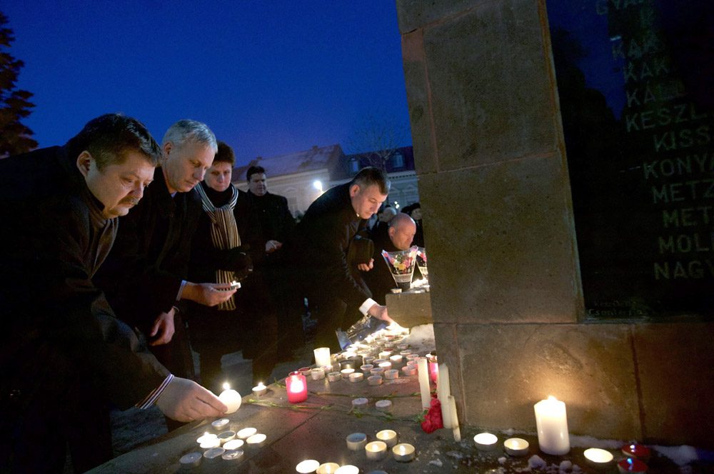 Szász Jenõ, a Nemzetstratégiai Kutatóintézet elnöke (b), Soltész Miklós egyházi, nemzetiségi és civil társadalmi kapcsolatokért felelõs államtitkár (b2) és Gálfi Árpád polgármester (b4) a veronai buszbaleset áldozatainak emlékéért rendezett gyertyagyújtáson Székelyudvarhelyen 2017. január 22-én.