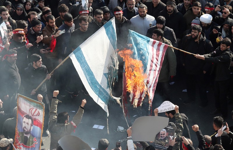 Az Egyesült Államok légicsapása ellen tiltakozó arabok amerikai és az izraeli zászlókat égettek/Fotó:MTI-EPA