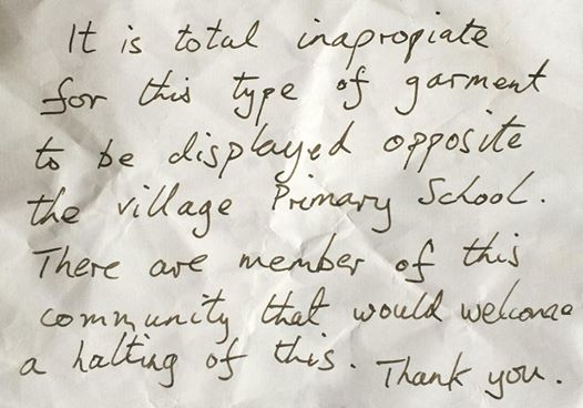 “Nem illik bugyit szárítani az általános iskolával szemben. Ebben a faluközösségben olyan emberek is élnek, akinek ez szúrja a szemét. Kérem, a következő alkalommal amikor alsóneműjét szárítani szeretné, vegye figyelembe ezt. Köszönöm!”
