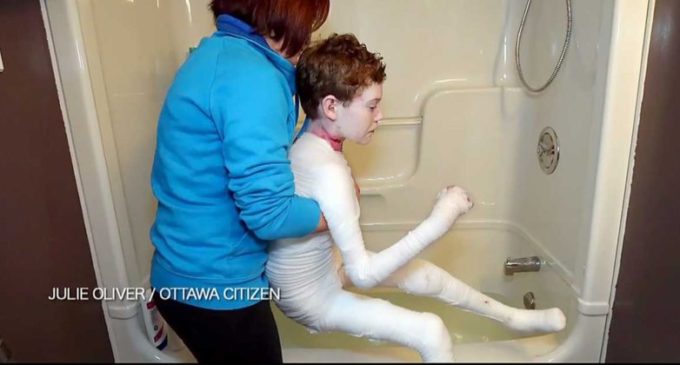Fürdeni a legrosszabb. Édesanyja, Tina segít neki a vízbe merülni, és aztán jön a mélypont minden héten: a kötszerek egyesével való cseréje. Kiabál fájdalmában, de muszáj végigcsinálniuk.