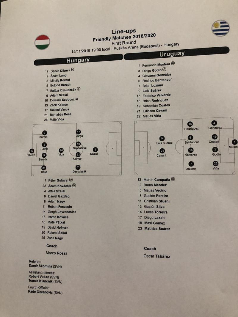 18:19 – Íme, a magyar és az uruguay-i válogatott kezdőcsapata: