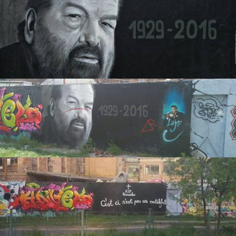 Azonban április 27-én csütörtök reggelre az egész Bud Spencer festmény festmény elveszett. Feketére festették az egész alkotást az emlékfalon.